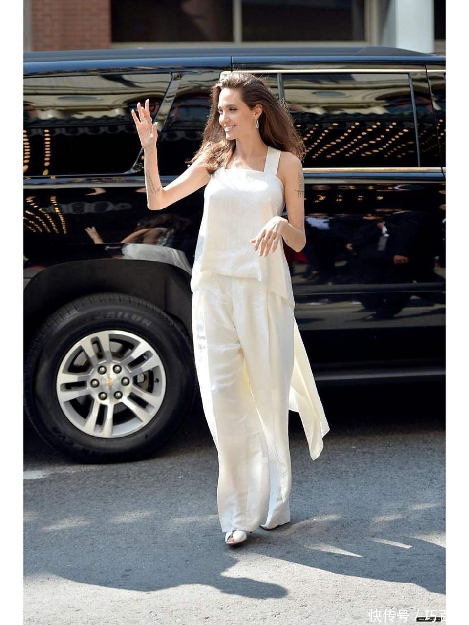 安吉丽娜朱莉很少秀身材,偶尔选择吊带但基本不会选择直接露大腿的长裤,吊带款式的拖地连衣裙最常见。