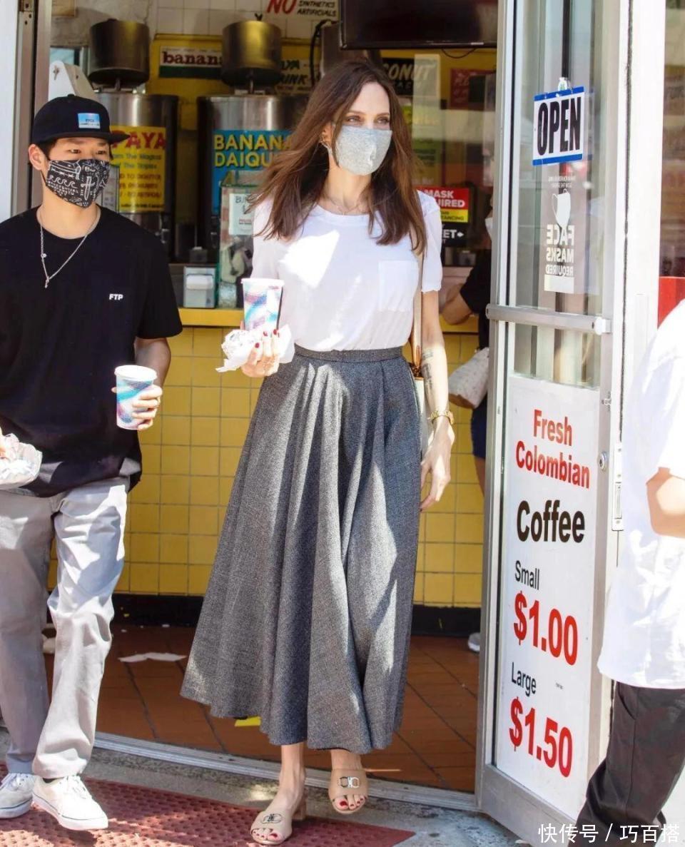 灰色圆领T恤搭配黑色高腰半裙,基础低调,和其他中老年女性不同的是,安吉丽娜朱莉并不喜欢温柔恬静的淑女风,清冷知性、极简禁欲的大女人风是她的最爱。